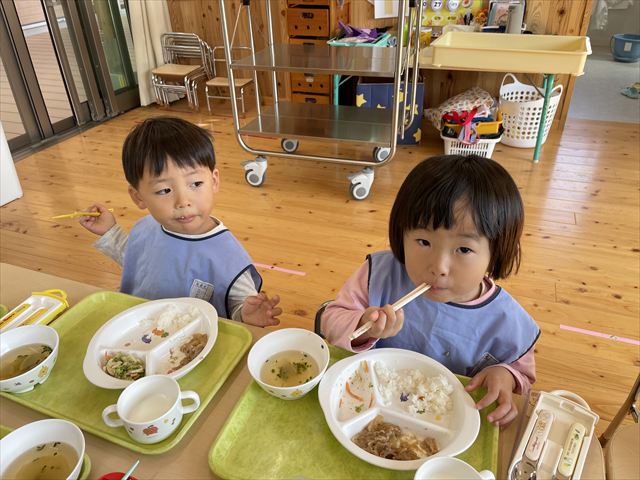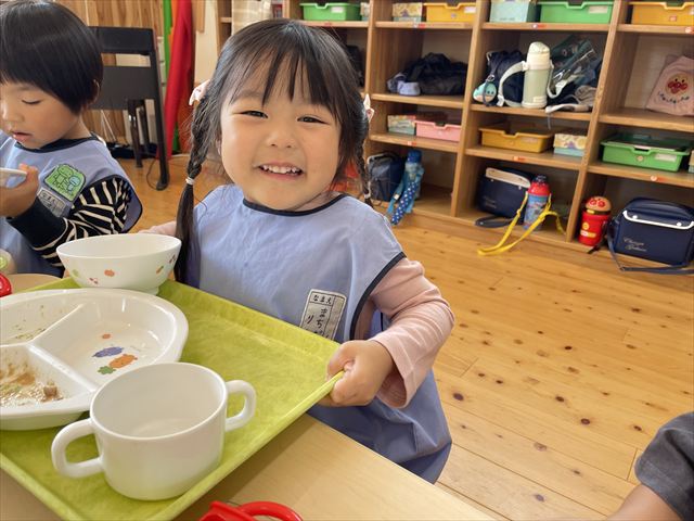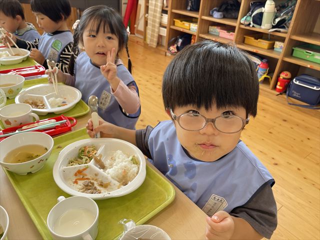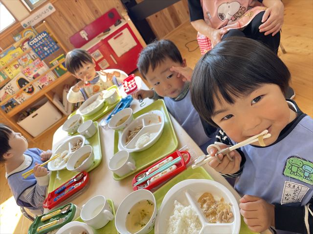 給食の時間には「クワちゃん、お空に行ったかな?」「どんぐりのスープ食べたいな〜」と、さっきの出来事を思い出しながら楽しそうな会話が広がりました。