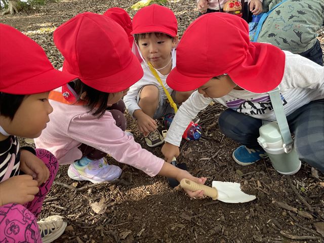子ども達は小さな手で大事そうに箱を持ち、「ありがとう」「お空でもゼリー食べてね」と言葉を掛けながら、穴を掘っていました。お供え物にどんぐりも…
