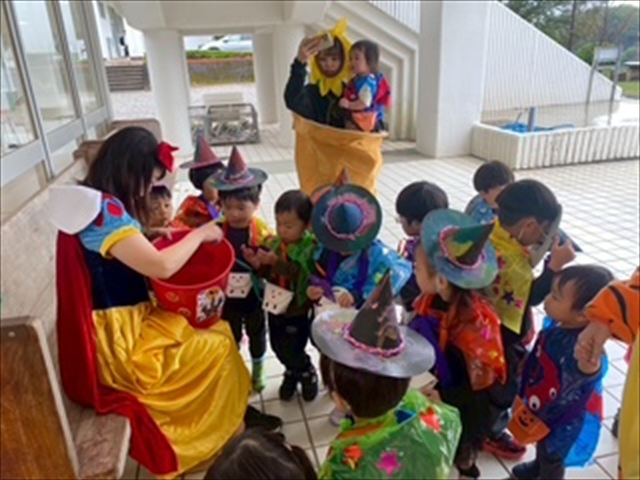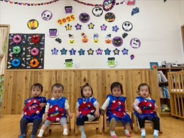 てんし組は、つき組・ほし組のお兄ちゃん、お姉ちゃんと一緒にハロウィンパーティーをして楽しみましたよ。