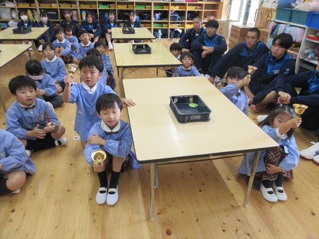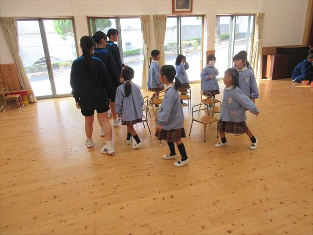 また、今日は鎮西学院の高校生が交流に来ていましたので、ハンドベルの後にホールでゲームをしました!お姉ちゃん、お兄ちゃんと一緒に椅子取りゲームです☆