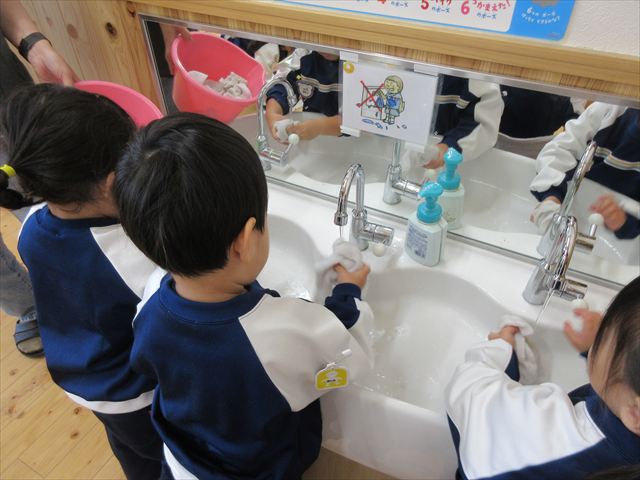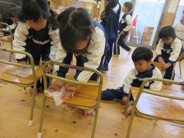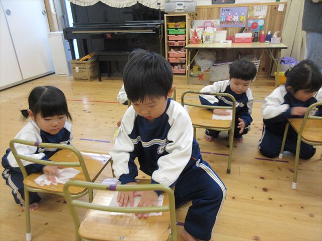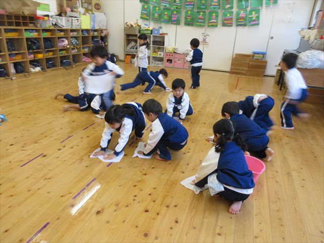 大掃除が始まると知ると、なぜか大喜びの子ども達...。雑巾がけの途中でお友達とぶつかりそうになったらじゃんけんをして譲り合ったり、雑巾絞りに挑戦したり、元気いっぱいに頑張りました(*^^*)