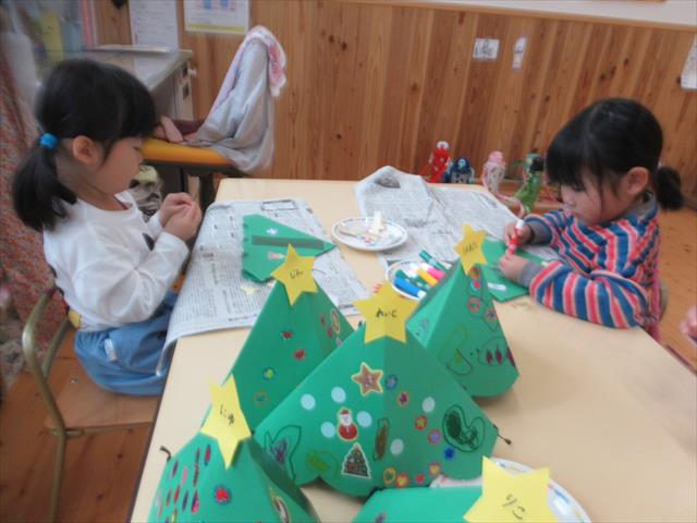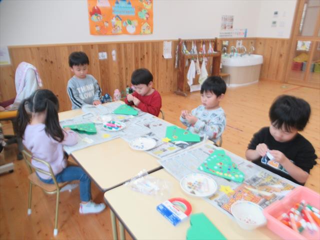 ひかり組さんはツリーの形の画用紙にお絵かきやシール貼りをして、