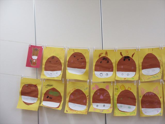 その後は、耳や顔をクレヨンで描き、うまの完成です。