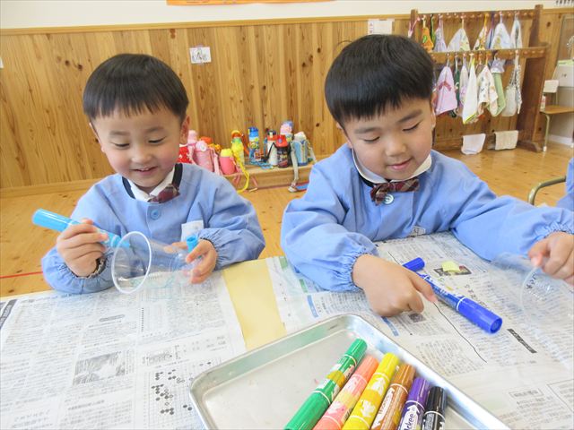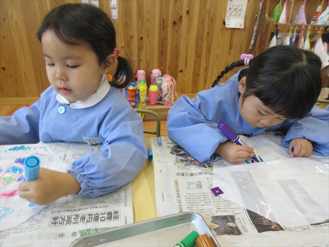 凧の制作もしました!ビニールに絵を描くとつるつる滑るような感触なので、慎重に描く子もいれば、つるつるを楽しんでいる子もいて、見ていて面白かったです。