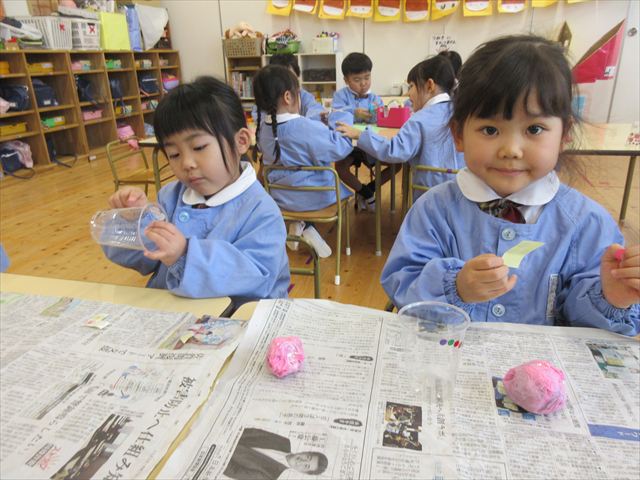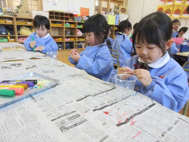 プラスチックのコップに絵を描いたりシールを貼ったり、玉は丸めた新聞紙を花紙で包んで作りました。