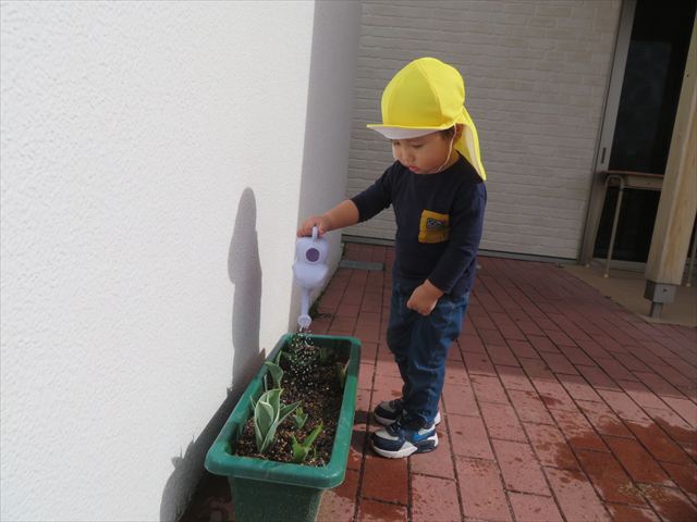 みんなで植えたチューリップも大きくなり、外へ出る時は水やりが日課になってきました。