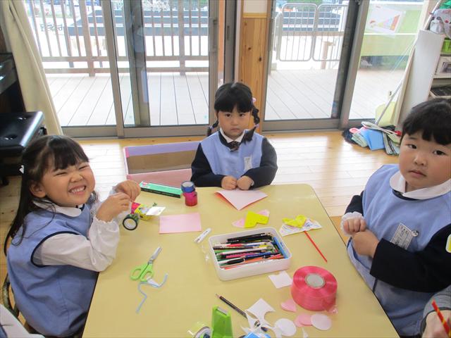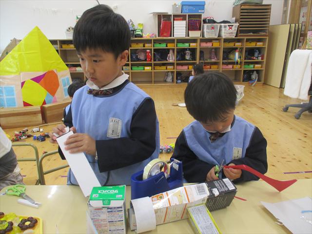 今日は自由遊びの様子をお伝えします。玩具・空き箱・ハサミやテープ等の使い方をみんなで確認しました。約束を守りながら遊んでいます。