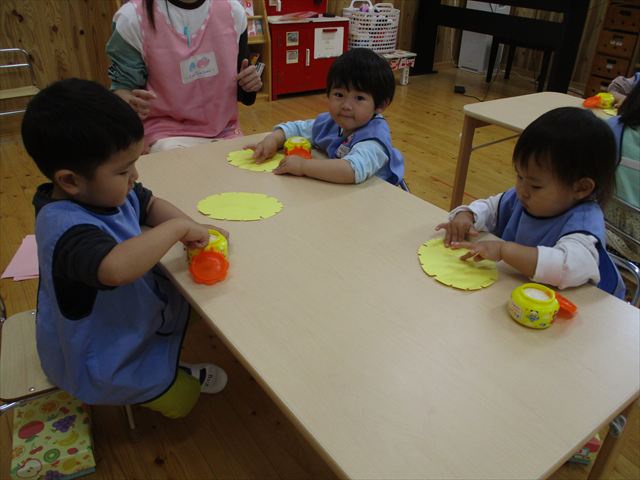 タンポポは小さな花びらがいくつも集まって1つの形を作っているお花なので、小さな花びらをシールで表現しました。画用紙いっぱいに満遍なく貼ったり、1つ1つ並べたり、ペタペタ貼って楽しんでいました(^_^)