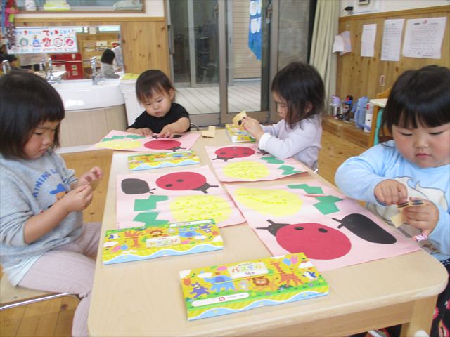 まずは、てんとう虫の目・体、ダンゴ虫の目にシールを貼りました。