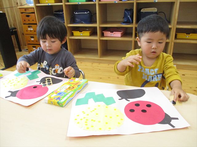 園庭でもよく見つける虫たちなので、先生のお手本を見ながら「足もつけないと!」「お友達も描こう」などと言い、それぞれ完成イメージを湧かせていました(*^^*)