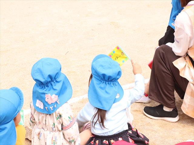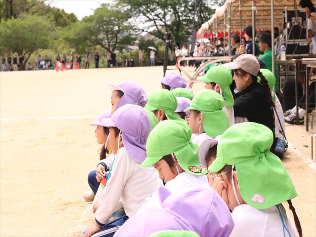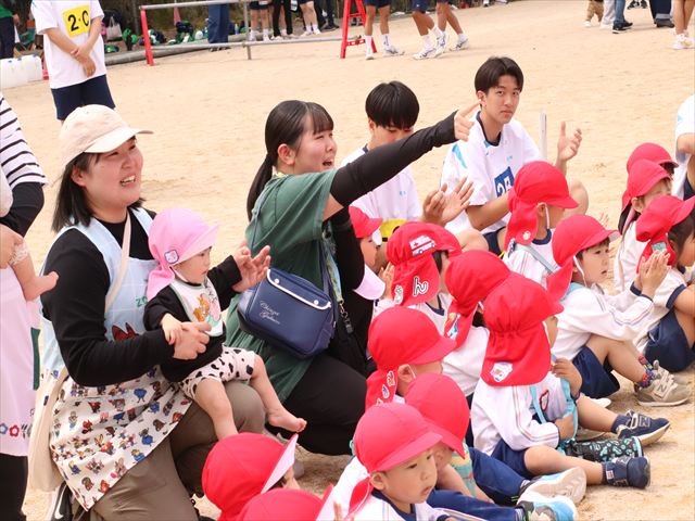 広いグラウンドで行われるかけっこやリレー、迫力のある応援合戦に、子どもたちは「すごいね!」「はやい!」と目を輝かせながら見入っていました♪