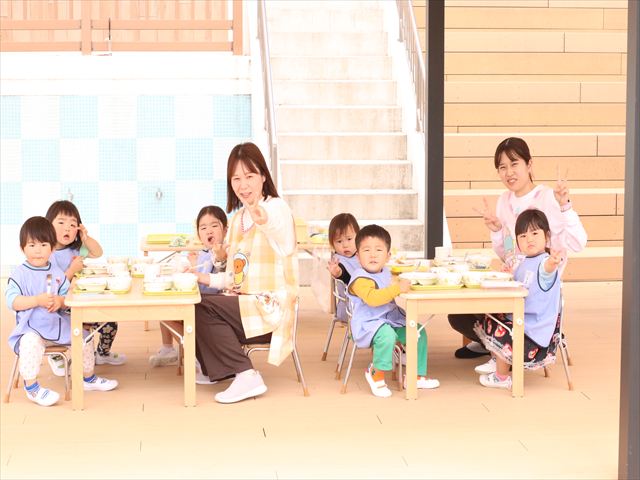 園に帰ってくると、ほしぐみさんがウッドデッキでピクニックをしていました〜!